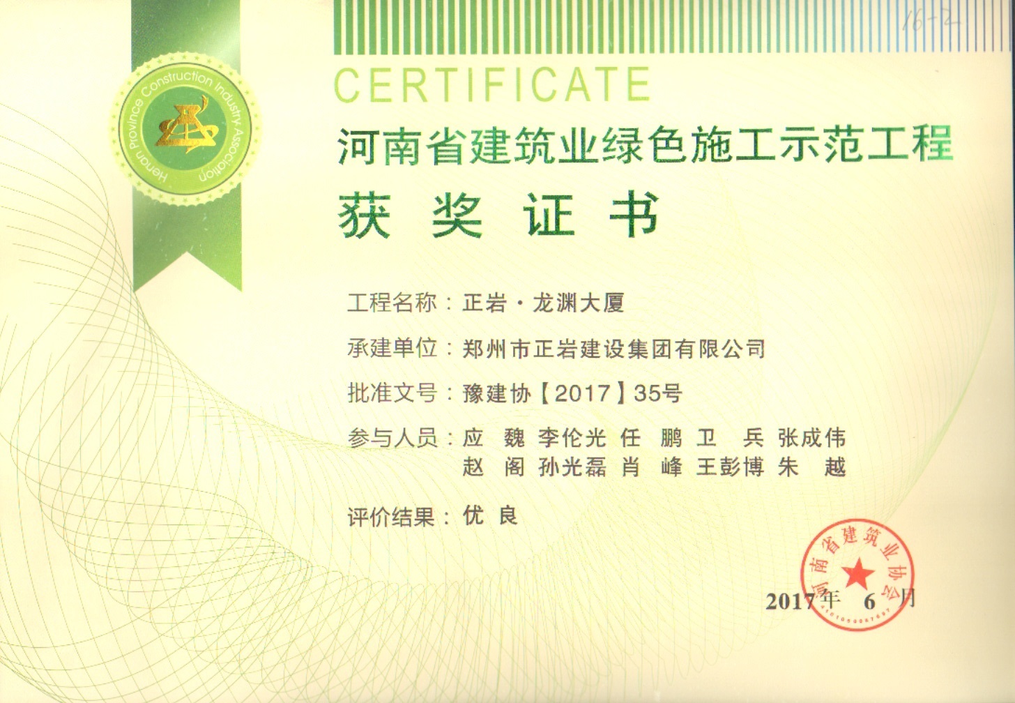 2017河南省建筑業(yè)綠色施工示范工程獲獎(jiǎng)證書