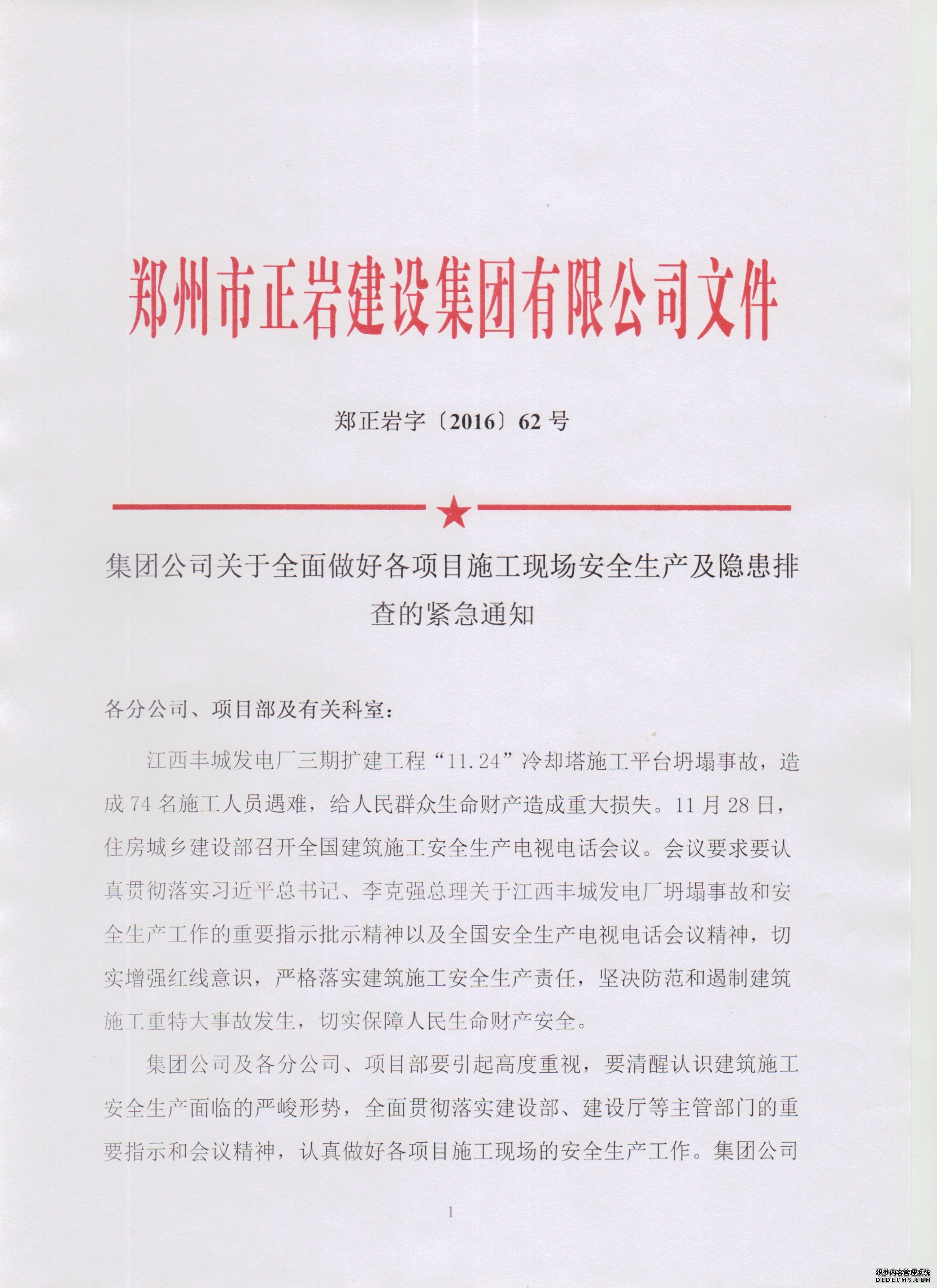 鄭正巖字〔2016〕62號(hào) 集團(tuán)公司關(guān)于全面做好各項(xiàng)目施工現(xiàn)場(chǎng)安全生產(chǎn)及隱患排查的緊急通知