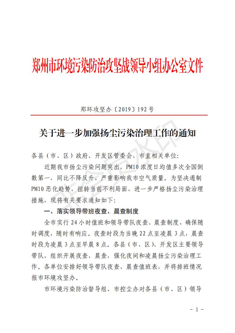 鄭環(huán)攻堅辦【2019】192號關(guān)于進(jìn)一步加強(qiáng)揚塵污染治理工作的通知