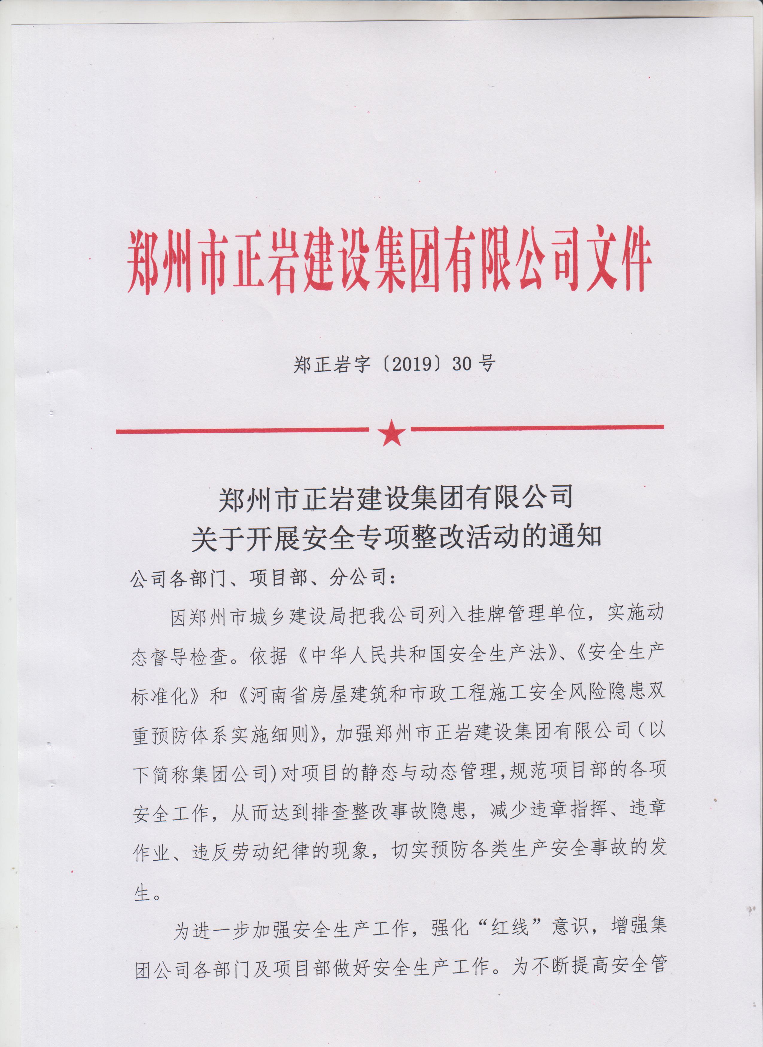 鄭州市正巖建設(shè)集團(tuán)有限公司關(guān)于開展安全專項整改活動的通知
