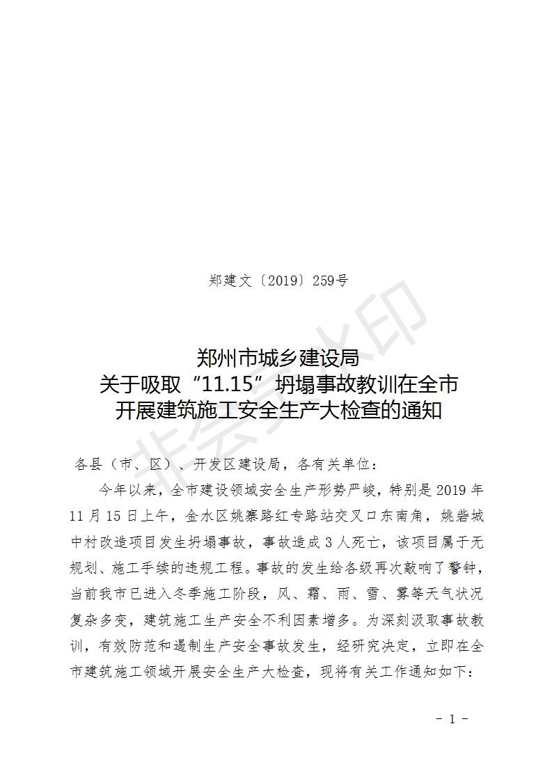 鄭州市城鄉(xiāng)建設(shè)局 關(guān)于吸取“11.15”坍塌事故教訓(xùn)在全市 開(kāi)展建筑施工安全生產(chǎn)大檢查的通知