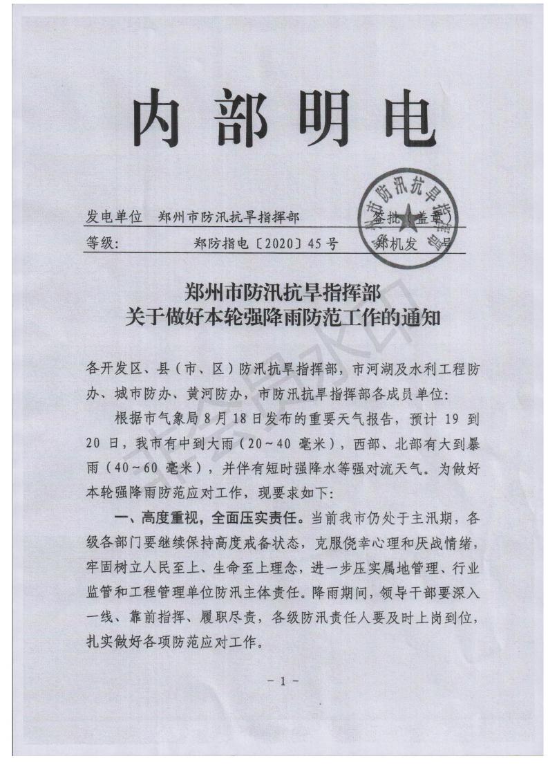 鄭州市防汛抗旱指揮部關(guān)于做好本輪強(qiáng)降雨防范工作的通知