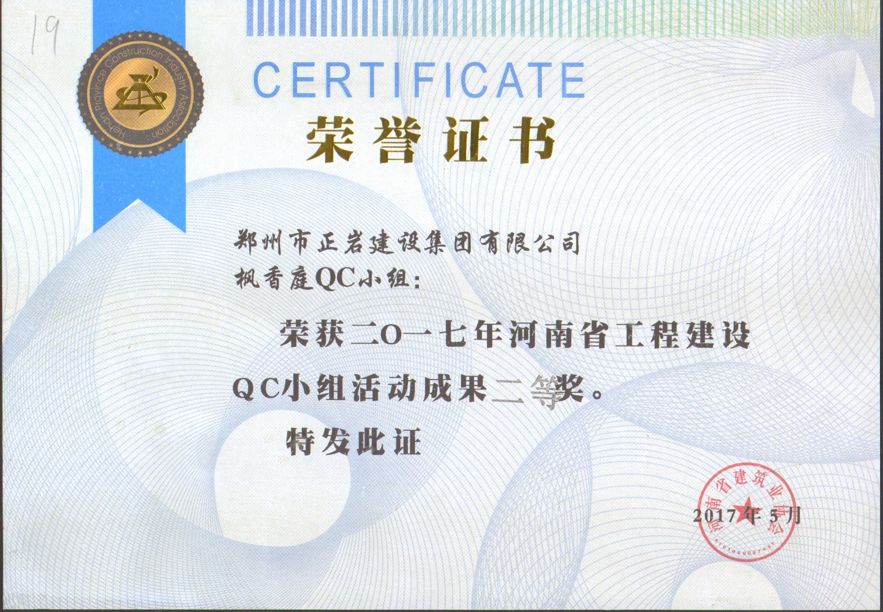 5月5至6日,2017年河南省工程建設(shè)優(yōu)秀QC小組成果交流會(huì)在嵩陽(yáng)飯店舉行,全省有122項(xiàng)發(fā)布成果和近440項(xiàng)交流成果,其中公司“楓香庭QC小組”獲得河南省工程建設(shè)優(yōu)秀QC小組二等獎(jiǎng)。