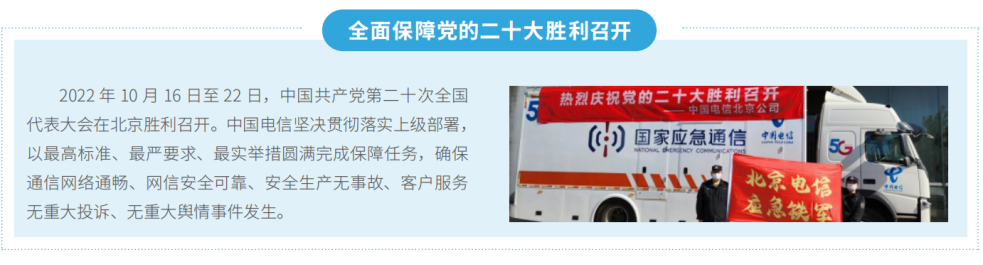中國(guó)電信嚴(yán)格落實(shí)黨的二十大重保工作要求,以最高標(biāo)準(zhǔn)扎實(shí)做好服務(wù)保障工作。加強(qiáng)通信網(wǎng)絡(luò)運(yùn)營(yíng)保障、網(wǎng)信安全保障、重要業(yè)務(wù)保障和重要客戶端到端服務(wù)保障,完善各場(chǎng)景應(yīng)急預(yù)案、應(yīng)急機(jī)制和工作流程,以最高標(biāo)準(zhǔn)、最嚴(yán)要求、最實(shí)舉措圓滿完成黨的二十大保障工作。