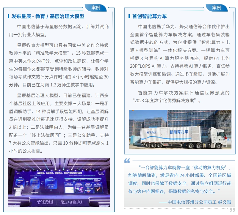 中國電信結(jié)合自身在算力、數(shù)據(jù)、行業(yè)應(yīng)用等方面的優(yōu)勢,依托 AI 能力自主研發(fā)星辰語義大模型,與合作伙伴共同開拓行業(yè)重點(diǎn)場景和細(xì)分場景大模型。構(gòu)建“1+N+M”(1 是通用基礎(chǔ)大模型,N 是行業(yè)大模型數(shù)量,M 是自用大模型數(shù)量)的星辰大模型系列產(chǎn)品體系,面向政務(wù)、教育、交通等垂直領(lǐng)域發(fā)布 12 個行業(yè)大模型。推出“星辰 MaaS(Model as a Service,模型即服務(wù))平臺”,為客戶提供智算算力、通用大模型、行業(yè)大模型、能力工具、數(shù)據(jù)集于一體的大模型服務(wù)。