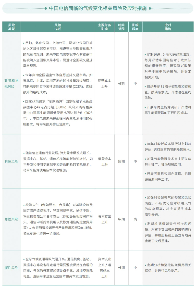 中國電信積極應對氣候變化,將氣候相關風險管理納入風險管理,實現(xiàn)風險梳理、風險評估、關鍵風險分析、風險應對和風險監(jiān)測跟蹤的閉環(huán)管理。針對不同的風險類別,評估其對財務和運營發(fā)展的影響,并提出相應措施。